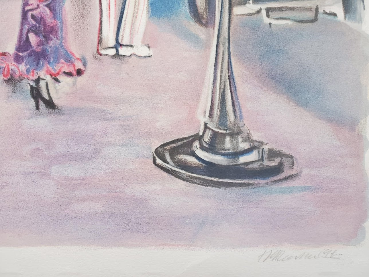 A scene from an outside cafe with couples seated at tables and a woman holding a parasol standing with a tiny dog close by. ORIGINAL and HAND SIGNED, Color lithograph. 23 1/4 x 31 in.