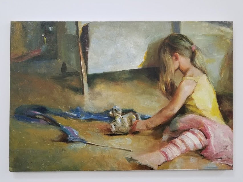 Rautiola's painting style is characterized by its expressive brushstrokes and impressionistic approach, giving the artwork a dynamic and textured feel. The strokes are visible and energetic, contributing to a sense of movement and vitality within the stillness of the scene. The use of light and shadow is evident, with the light source seemingly coming from the left, highlighting the girl's side profile and casting shadows that add depth to the composition. The background is suggestive rather than detailed, allowing the viewer's focus to remain on the girl and her toy, while also providing a sense of the space in which she is situated. This style helps to create a personal and intimate glimpse into the child's world, one that is filled with simplicity and the richness of imagination.