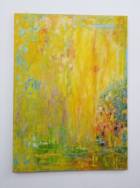 The painting titled "Paradise" is an abstract piece that exudes a warm, ethereal glow, largely due to its luminous yellow tones that occupy most of the canvas. These yellows range from golden to lemon hues, applied with both washes and textured brushstrokes, giving the impression of a space filled with light and warmth. The yellow could symbolize sunlight, suggesting an environment that is inherently bright and joyful, much like the idealized notion of paradise.