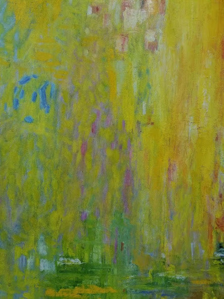 Amidst this sunny backdrop are whispers of greens, blues, pinks, and oranges near the bottom, mingling to create what could be interpreted as a landscape or garden in bloom—a common representation of paradise. The colors appear more concentrated at the base, reminiscent of the way flora might ground a heavenly scene.