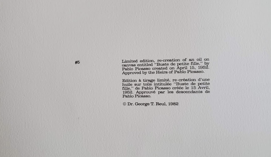 After Pablo Picasso's death in 1973, his granddaughter Marina authorized the printing of these original lithographs, which have come to be known as the Picasso Estate Collection. The lithographs were meticulously created after the original works (Oil Paintings, Watercolors, Pastels, Charcoal Drawings, etc.) by Master Chromist Marcel Salinas, who worked closely with Picasso in his lifetime. They are printed in an edition of 500 on first-quality Arches paper. To ensure authenticity, each print is signed and numbered in pencil by Marina Picasso and embossed with the estate and chromist's seals, along with the legend on the reverse "Approved by the heirs of Pablo Picasso". These rare and highly desirable prints have sold in galleries across the United States and Europe and are now being offered widely for the first time since their publication.