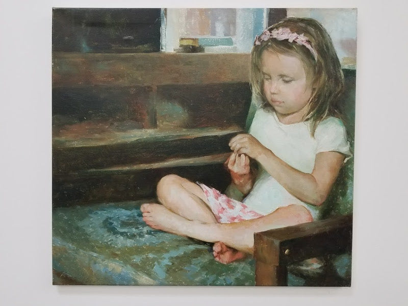 Rautiola's painting style is evident in the expressive brushwork, capturing the textural contrasts between the wood, the fabric of the dress, and the girl's skin. The strokes are confident and deliberate, conveying the tactile qualities of the surfaces. The choice of palette—cool tones for the background and warmer tones for the figure—further emphasizes the subject, drawing the viewer into the quiet moment. The title "Enigma" aptly reflects the painting's evocation of quietude and the unfathomable depth of a child's inner world.
