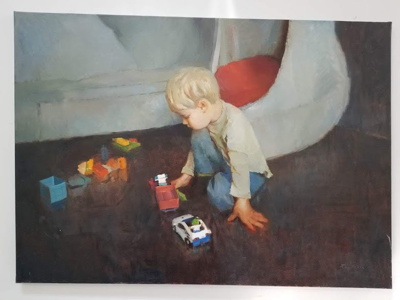 "Good Guys" by Antti Rautiola is a tender representation of childhood innocence and imagination. The painting depicts a young boy playing on the floor with a collection of brightly colored blocks and a toy police car, which are presumably the 'good guys' in his imaginative play. The boy is captured in a natural state of concentration and play, typical of young children deeply engaged in their own worlds of make-believe.