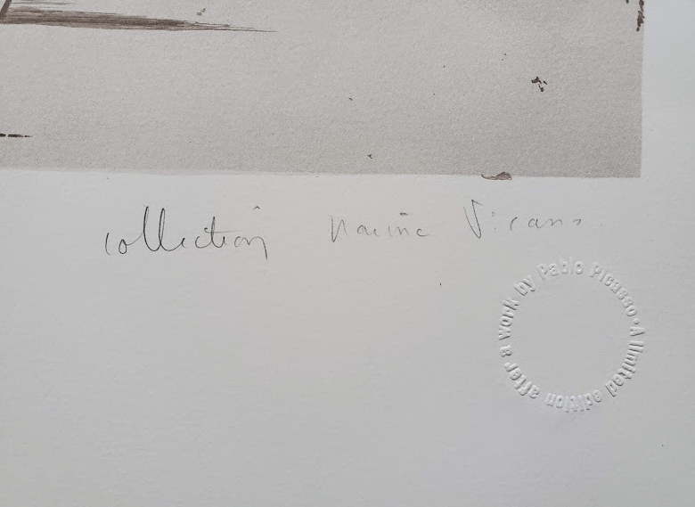 From the estate of Pablo Picasso, hand signed in pencil by Marina Picasso, with an embossed blindstamp in the lower right side of the piece.