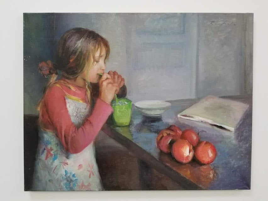 The artist employs an impressionistic style, with visible, textured brushstrokes that convey the liveliness and fleeting nature of the bubbles she creates. The girl's apron, with its floral design, adds a playful contrast to her pink and red attire. On the table beside her are red apples and an open book, suggesting perhaps a pause in her reading for this whimsical activity. The composition balances the figure with still life elements, creating a snapshot of a moment that feels both transient and timeless. This painting by Antti Rautiola beautifully captures the innocence and enchantment of childhood in its purest form.