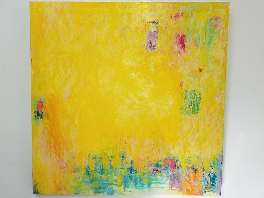 The painting titled "Happiness" by Kalevi Liska is an abstract composition dominated by a vivid yellow background, which conveys a sense of brightness and joy. The yellow seems to be applied with energetic brush strokes, creating a dynamic texture across the canvas. Interspersed throughout the yellow field are small, rectangular blocks of color that appear almost like windows or doors to another dimension. These blocks are rendered in a variety of hues including blues, greens, reds, and purples, adding a playful contrast to the monochromatic yellow background. The small pops of color seem to float on the canvas, creating a sense of depth and movement. The overall effect is one of optimism and joy, as if the painting is a visual representation of the emotional state of happiness.