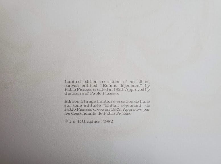 After Pablo Picasso's death in 1973, his granddaughter Marina authorized the printing of these original lithographs, which have come to be known as the Picasso Estate Collection. The lithographs were meticulously created after the original works (Oil Paintings, Watercolors, Pastels, Charcoal Drawings, etc.) by Master Chromist Marcel Salinas, who worked closely with Picasso in his lifetime. They are printed in an edition of 500 on first-quality Arches paper. To ensure authenticity, each print is signed and numbered in pencil by Marina Picasso and embossed with the estate and chromist's seals, along with the legend on the reverse "Approved by the heirs of Pablo Picasso". These rare and highly desirable prints have sold in galleries across the United States and Europe and are now being offered widely for the first time since their publication.