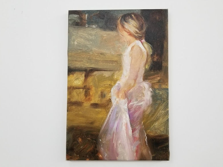 The painting "Beach Play" by Antti Rautiola presents a young girl seen from behind, capturing a moment of carefree play along the shore. Her dress, airy and translucent, billows gently, suggesting the presence of a soft seaside breeze. The pastel colors of the dress, with hints of pink and lavender, evoke the playfulness and innocence of childhood summers spent on the beach.