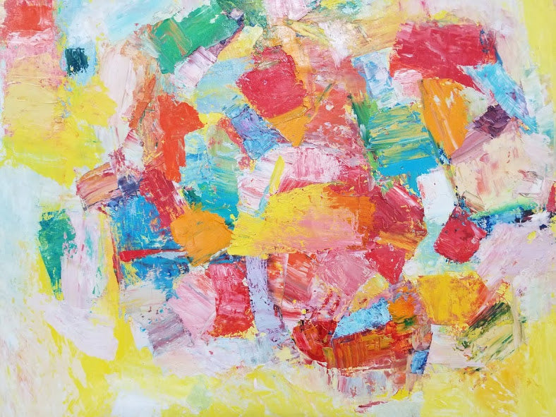The palette of bright yellows could represent the warmth and light typical of the Italian countryside, evoking the golden hue of afternoon sunlight in the Tuscan region, where Grassina is located. The patches of reds, blues, greens, and pinks might symbolize the varied and rich tapestry of the Italian landscape—rolling hills, vineyards, fields of flowers, and the rustic architecture for which the region is known.