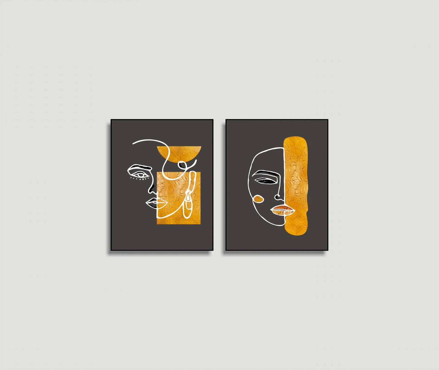 The image features two prints on canvas, both utilizing a minimalist line-drawing style with a monochromatic color scheme. The first canvas portrays a person's face and upper body with a hand over one eye, conveying a reflective or introspective mood. The second depicts an abstracted figure in a contemplative pose. Both pieces are defined by clean lines and solid color blocks, emphasizing form and posture over detail. The simplicity of the design and the bold use of blue against a white background give the artworks a modern, graphic quality.