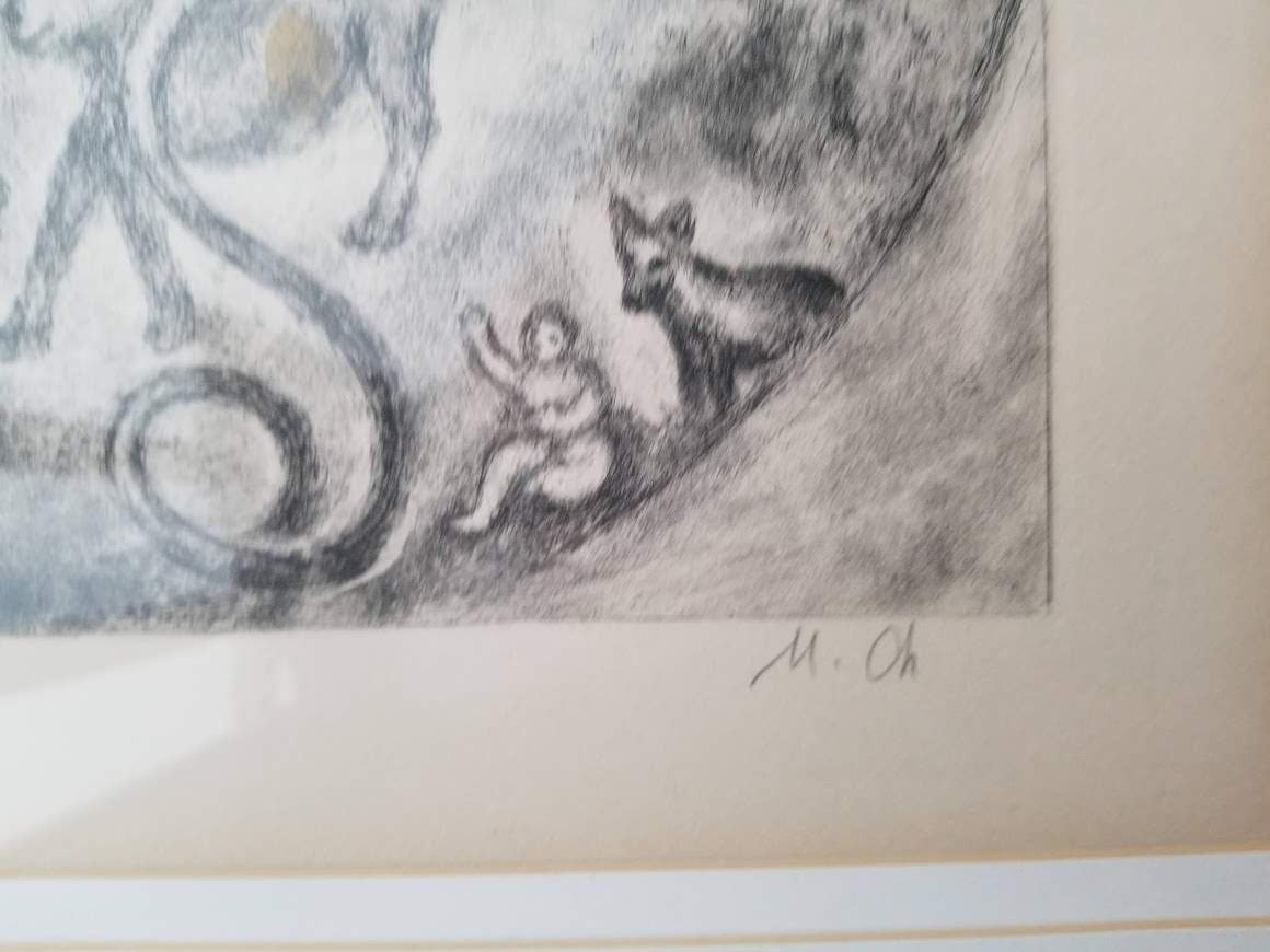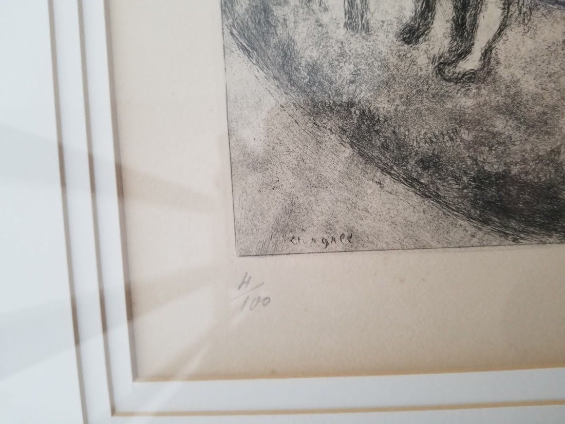 Etching with hand-coloring in watercolor on Arches wove paper. Initialed 'M. Ch' in pencil, numbered 4/100. From the edition of 100. Published in 1956 by Teriade, Paris. "La Bible" is one of Chagall's most important works. The work was originally commissioned by Ambroise Vollard in 1930. The artist spent the next 8 years from 1931 to 1939 etching the plates. Printing of the plates took place after the war, at first in Maurice Potin's studio and later at Raymond Haasen's. The cooper plates were then destroyed.